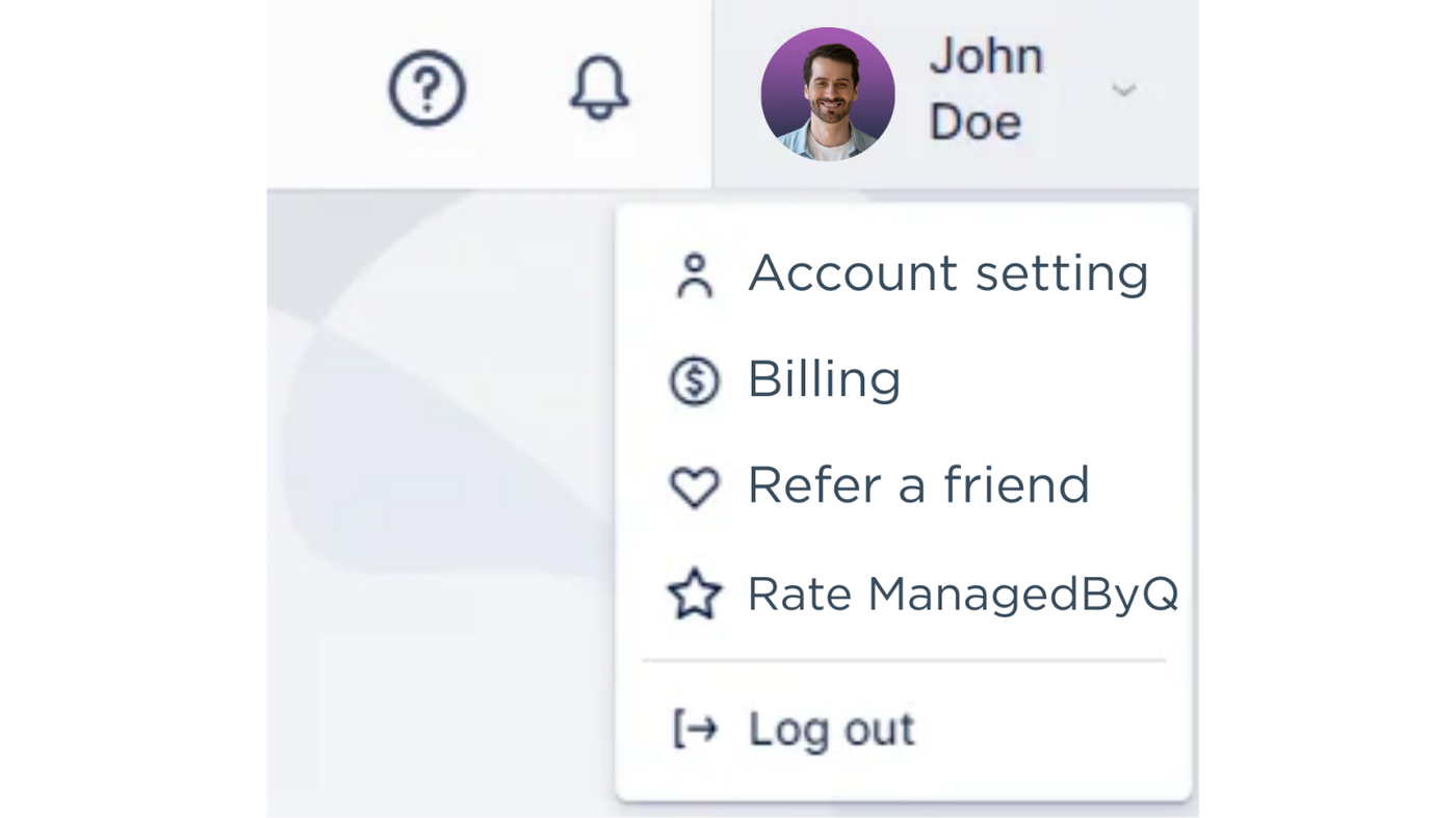 After logging into your ManagedByQ account as a super-admin, click your name or picture in the top right corner to see the following options: