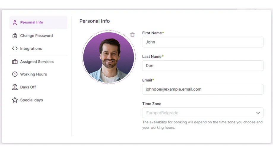 In this section, you can modify your First Name, Last Name, Email, and Time Zone. You can upload your profile picture by clicking on the photo field or dragging a photo into the area. Always click “Save Changes” at the bottom of the screen after updating your Personal Info settings.