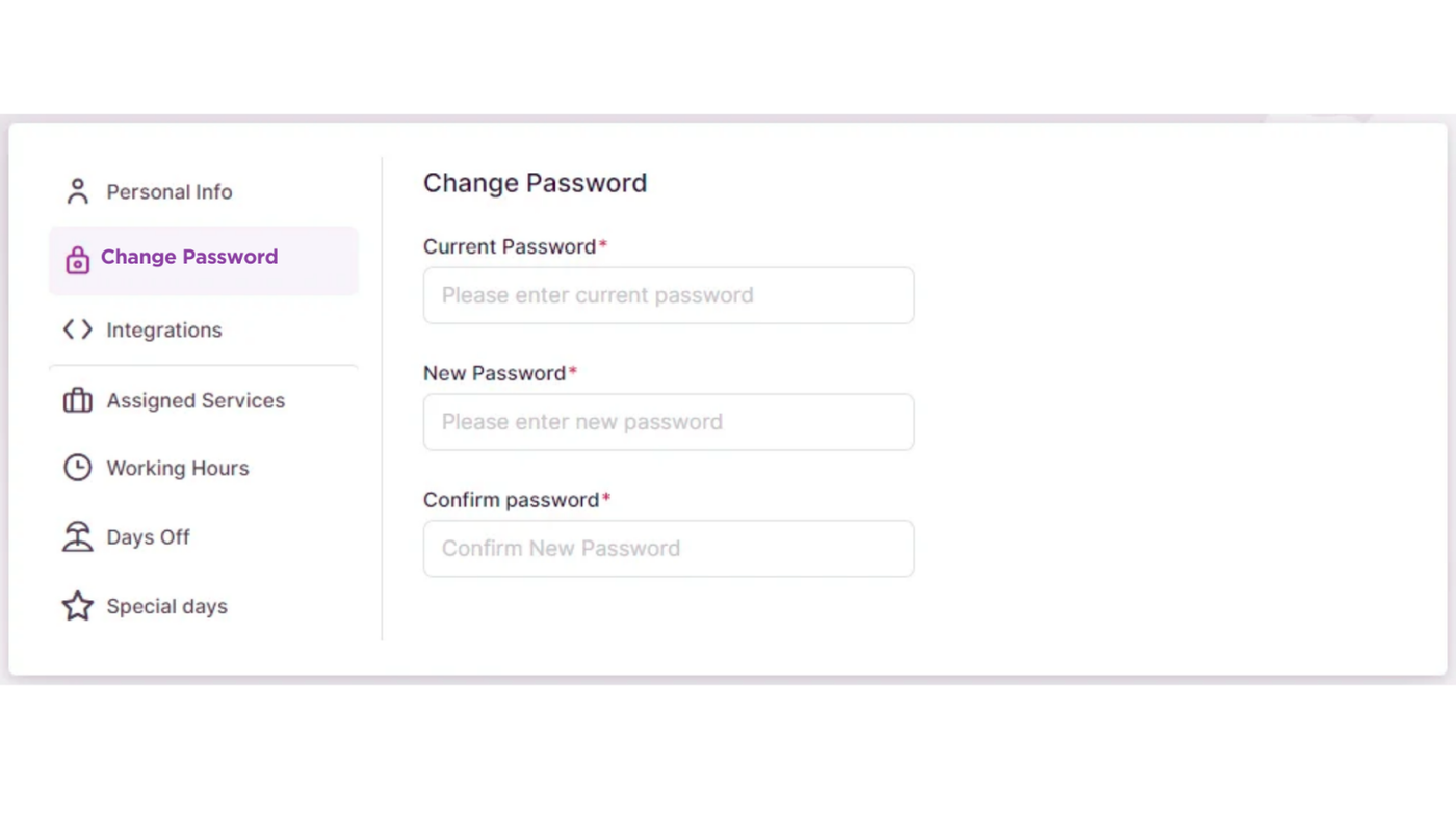 In this section, you can update the password you initially set during sign-up. Enter your current password, then your new password, and confirm the new password by entering it again.