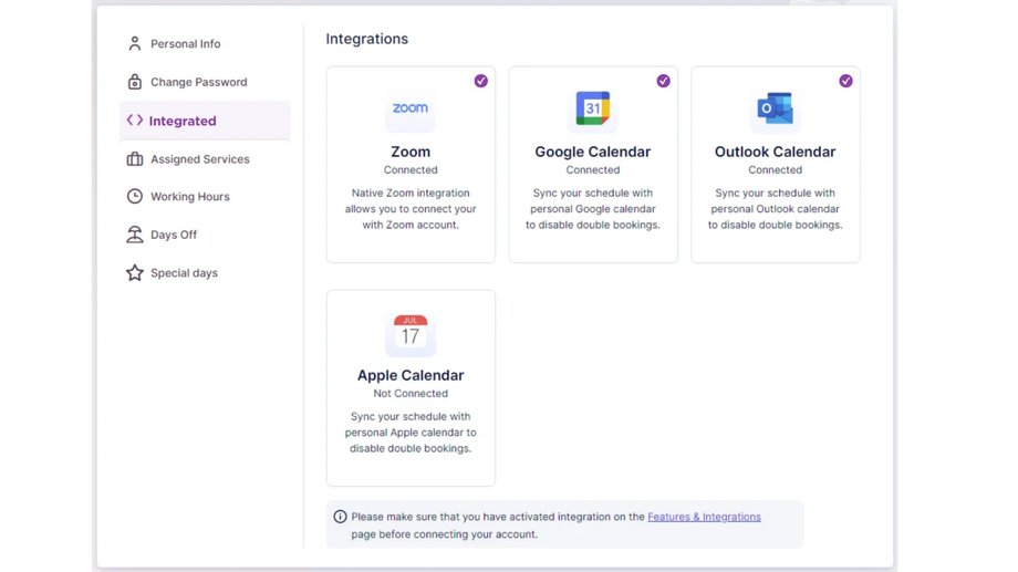 In this section, you can connect your own Zoom, Google Calendar, Apple Calendar, and Outlook Calendar with your ManagedByQ account. Other users will also have this option if the admin has activated these integrations on the Features and Integrations page.