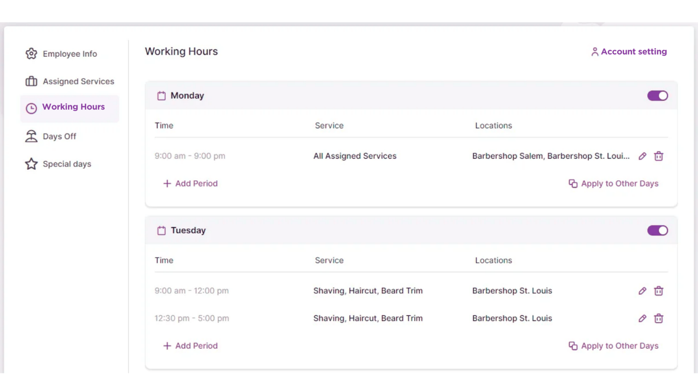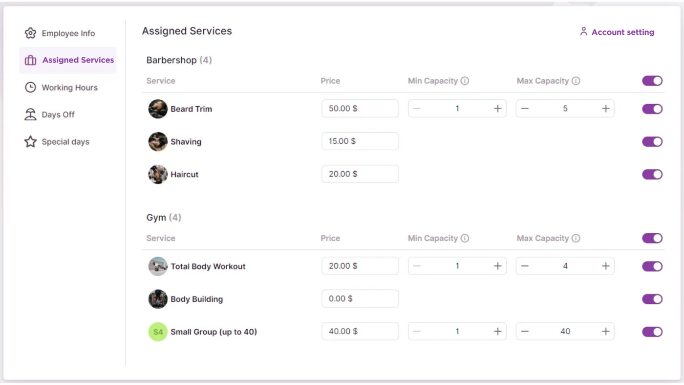 This section allows admins or users with custom roles to enable the services they are assigned to as employees.