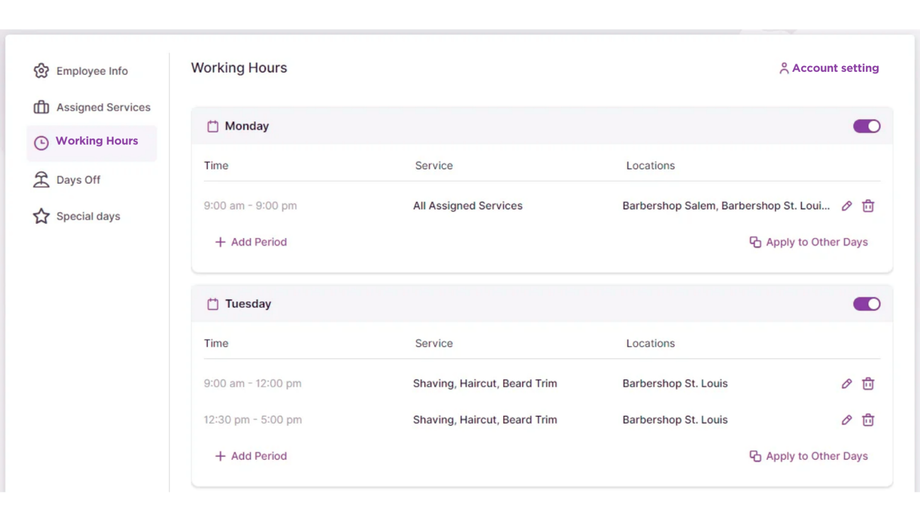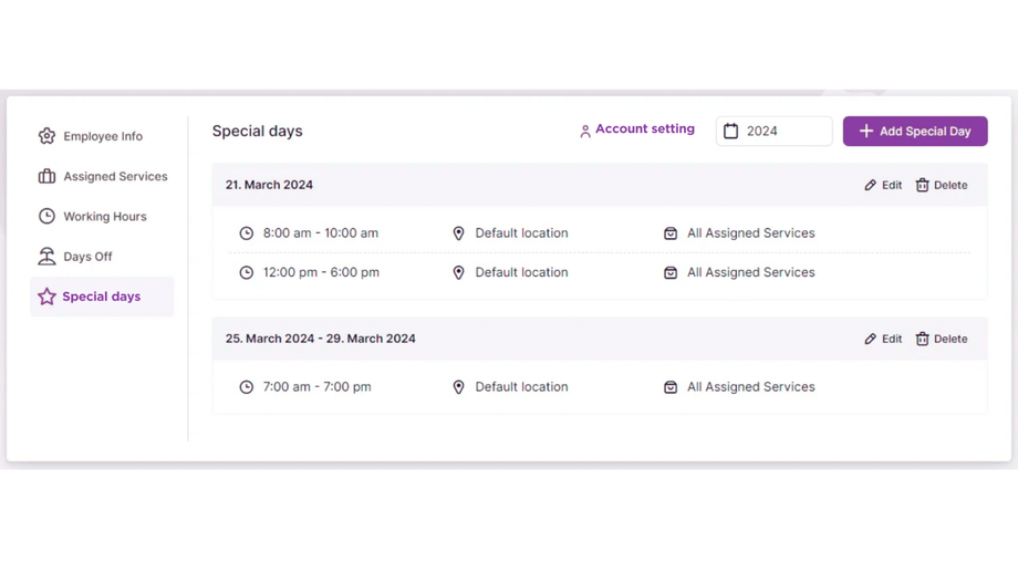 If enabled in ManagedByQ's Features & Integrations section, this option appears in Account Settings. Here, you can configure special working days that do not follow the standard Working Hours.