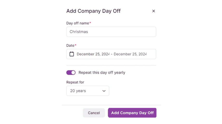 In the popup that appears, define the name of the day off, specify a single date by double-clicking the date or a date range by selecting the start and end dates. You can also choose whether the day off will be repeated every year. If you enable the option for the day off to repeat, you can select how many years it will repeat, ranging from 1 to 20 years.