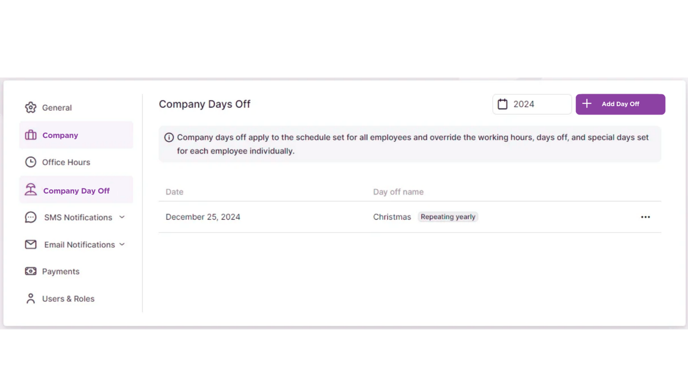 For instance, let’s say your business will be closed for a national holiday on December 25th. You can mark this day as a Company Day Off, which will automatically block the entire day from being available for appointments. This prevents any bookings on that day.