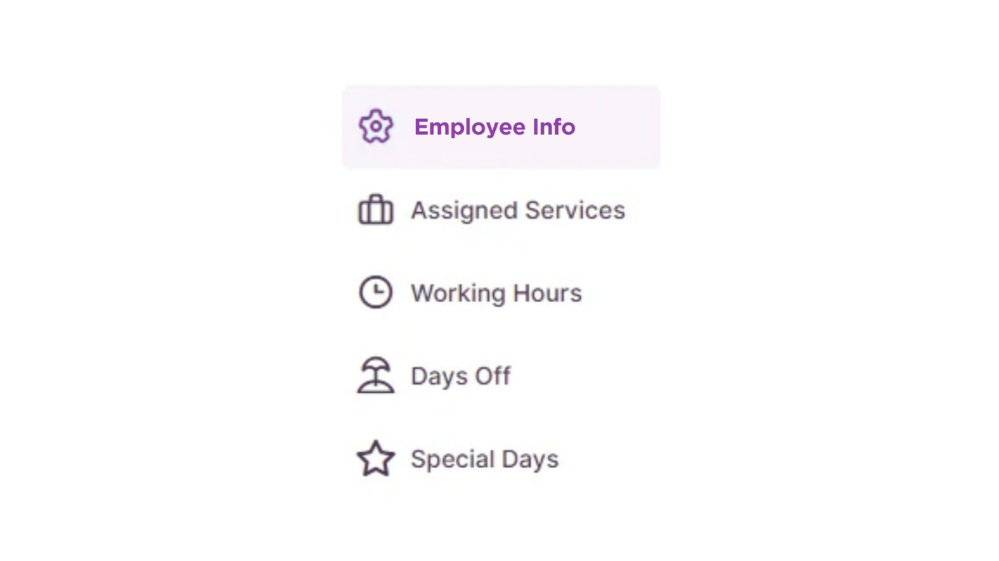 - Profile Image: Upload an image to help identify the employee in the Calendar, Employees, and Appointments pages. This provides customers with a visual during their booking process, making it easier to recognize the employee.