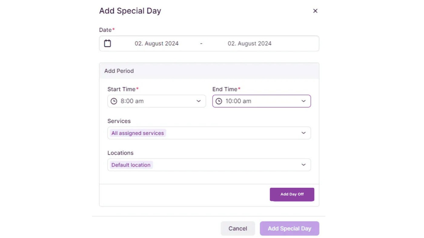 For instance, if an employee has a doctor’s appointment on August 2nd from 10:00 – 12:00, create a Special Day for that date with time periods that accommodate the absence. This feature ensures your schedules remain accurate even during special circumstances.