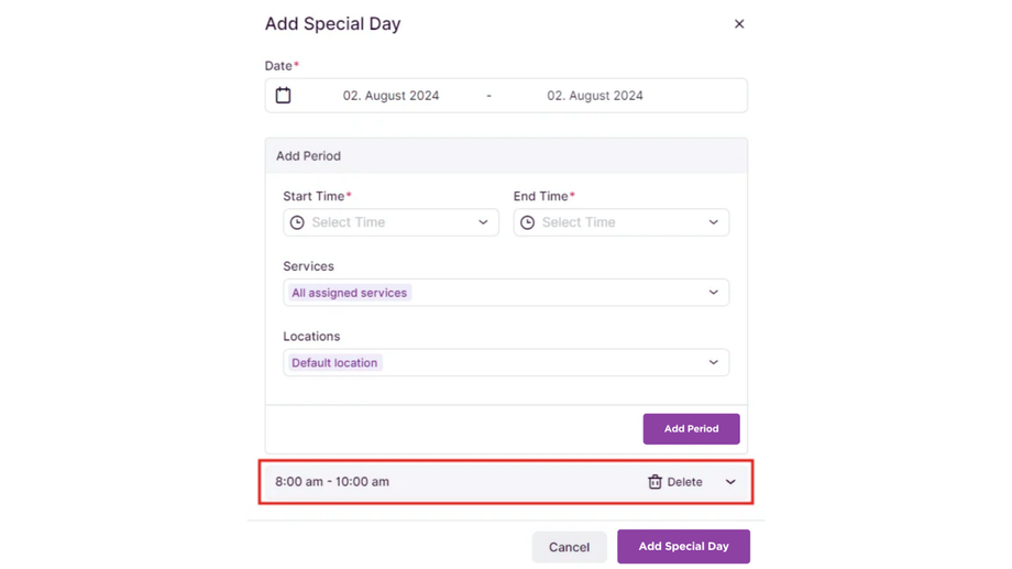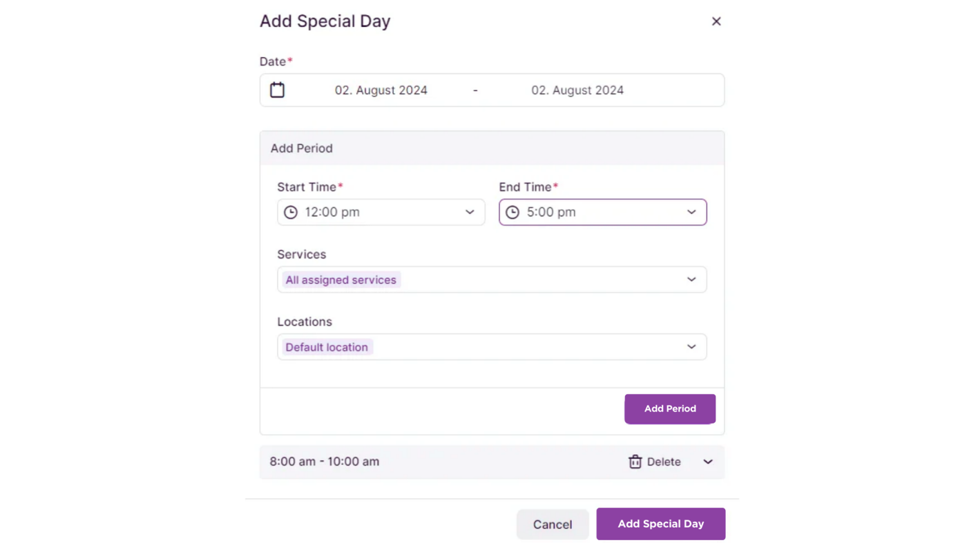 After adding the first period, such as 08:00 – 10:00, proceed to add the next period, like 12:00 – 17:00. Click on “Add Period” again if there are additional time slots needed. Once all the necessary periods are added, click on “Add Special Day” to save the entire schedule. It’s crucial to remember to click “Add Period” for each new time slot; otherwise, the Special Day will be saved with only the first period included