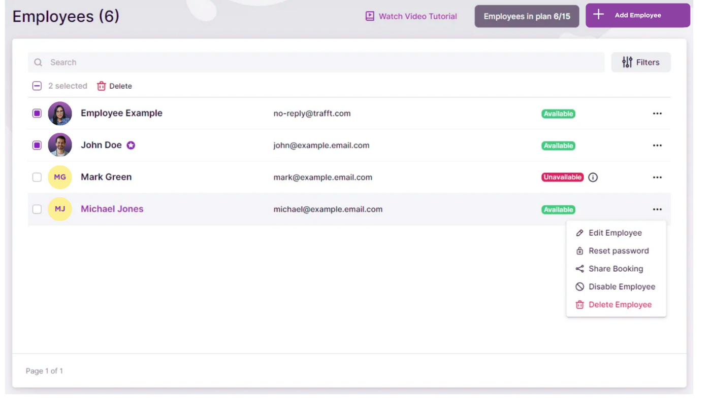 - Bulk Delete: Select multiple employees using the checkboxes next to their names and use the “Delete” option at the top of the page.