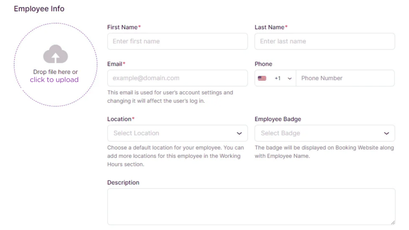 - Description: Use this field to provide a brief but informative description of the employee. Including details such as their experience, working style, and specialties helps customers choose the right employee for their specific needs and preferences. This personal touch enhances the customer’s booking experience and builds trust in the services offered.