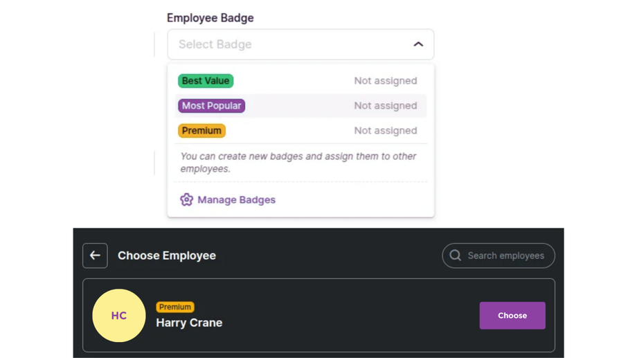 The Employee Badges feature in ManagedByQ allows you to highlight specific employees on your booking page, making them stand out from the rest. You can choose from default badges such as Best Value, Most Popular, and Premium, or create custom ones to fit your business needs.