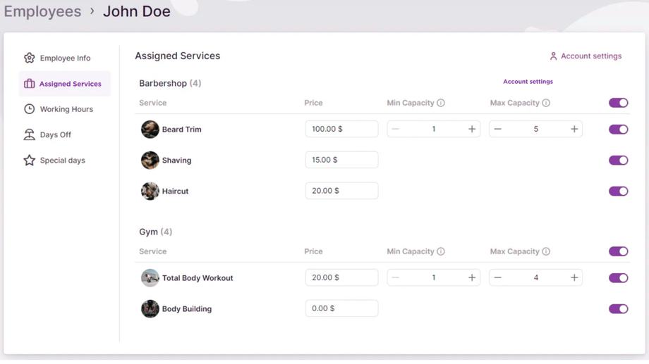 In the “Assigned Services” tab, you can manage which Categories and Services the employee will provide by enabling or disabling them. Once services are assigned to the employee, you can configure different prices for those services specific to that employee, as well as set different minimum and maximum capacities.