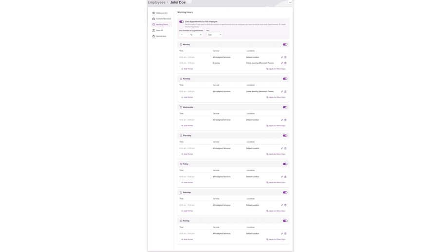 At the top of this page, you can also set limits on the number of appointments the employee can have per day, week, or month. These limits will override the available time slots in the employee’s schedule.