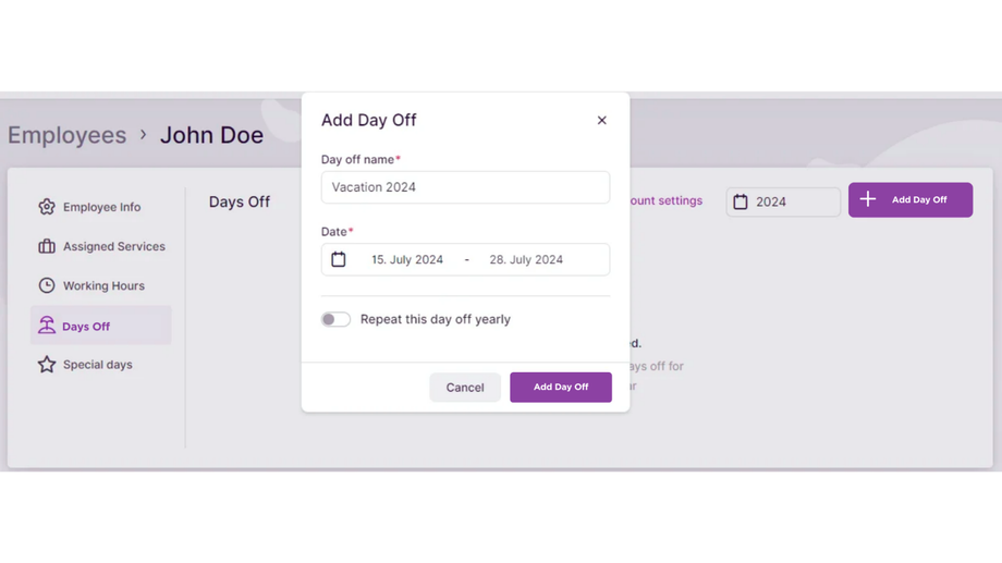 The “Days Off” section is where you can easily manage your employees’ time off, whether it’s for vacations, holidays, or sick days.