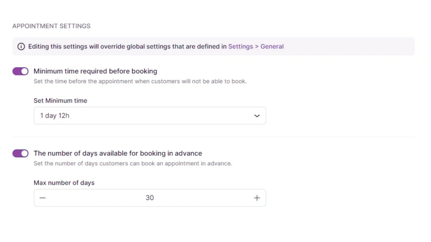 - For example, if the minimum time required before booking for all services is 1 day, you might want to adjust a specific service to require 7 days’ notice or any other time frame that fits your requirements.
