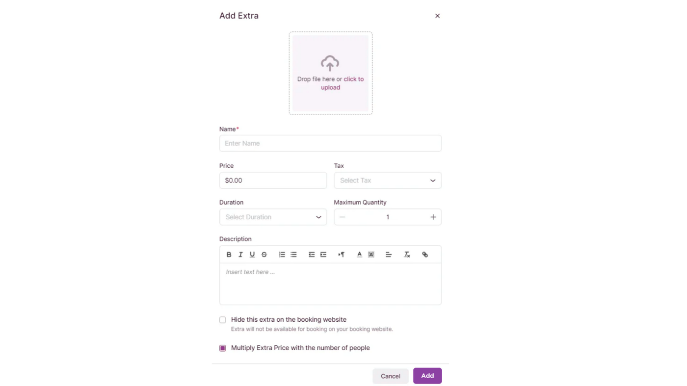 - Multiply Extra with the Number of People: Select this option if the price of the extra should be multiplied by the number of people booking the service (applicable for Group services).
