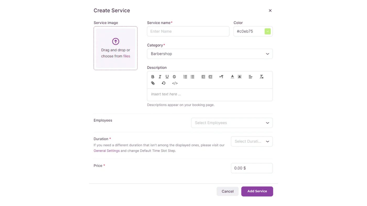 In this modal for creating a new service, you can configure the details for the service that you’ll offer to your customers on the Booking Website: