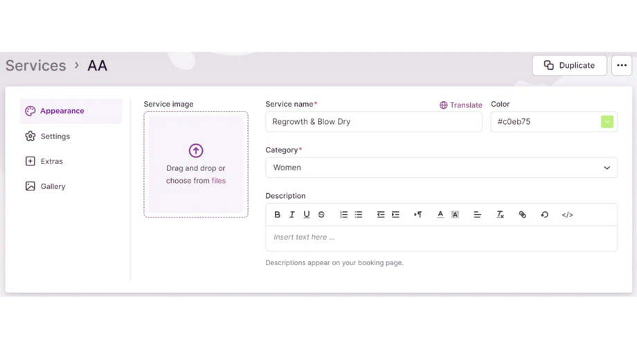 Uploaded images will appear as a slideshow on the booking page, offering a visually appealing way to present your service. This provides a visually appealing way to showcase what customers can expect from the service.