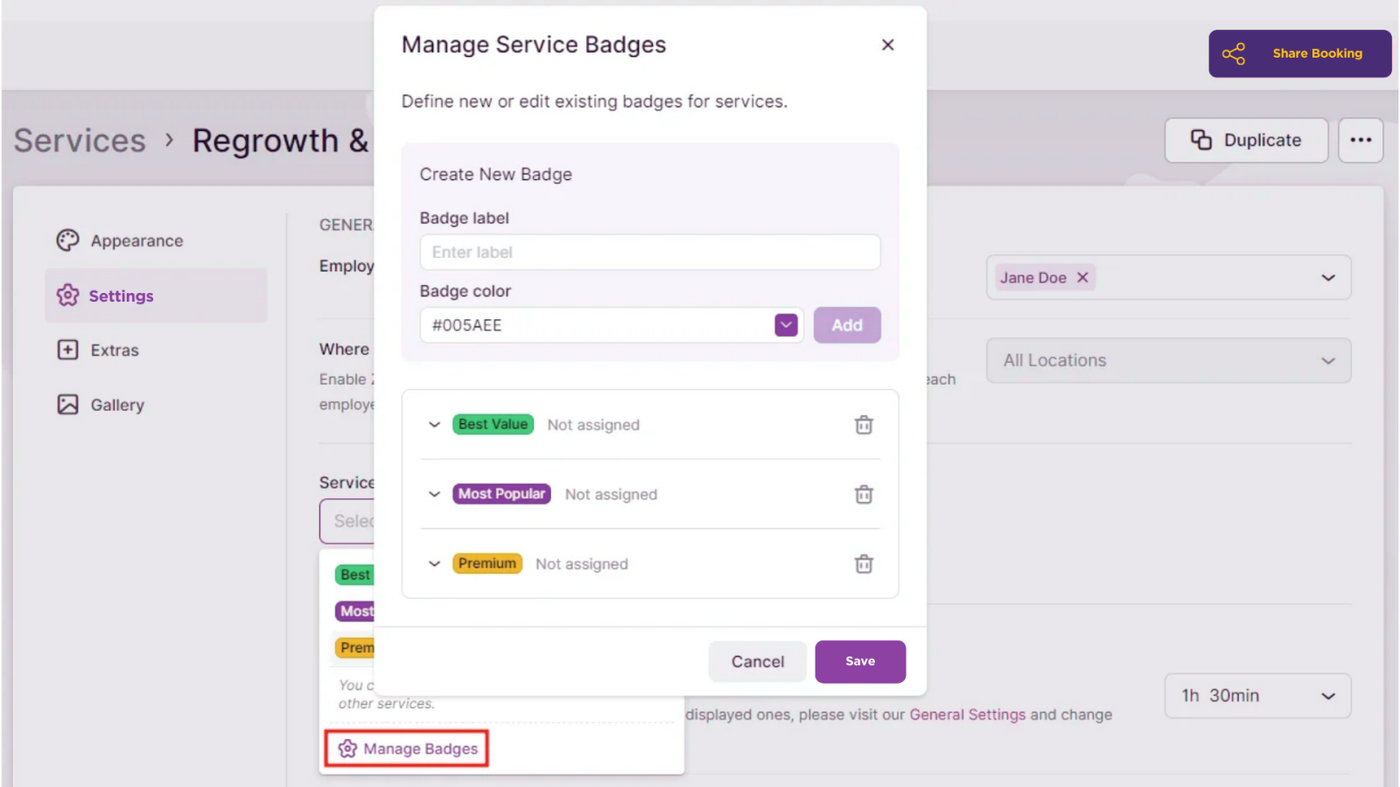 - Service Badge: This is a badge that can be assigned to the service to highlight it to your customers. When you expand the drop-down menu, you will see default badges already added to the account (such as Best Value, Most Popular, and Premium). Clicking on “Manage Badges” allows you to edit or delete existing badges and add new ones. These badges can be useful for highlighting special features or promotions for your services.
