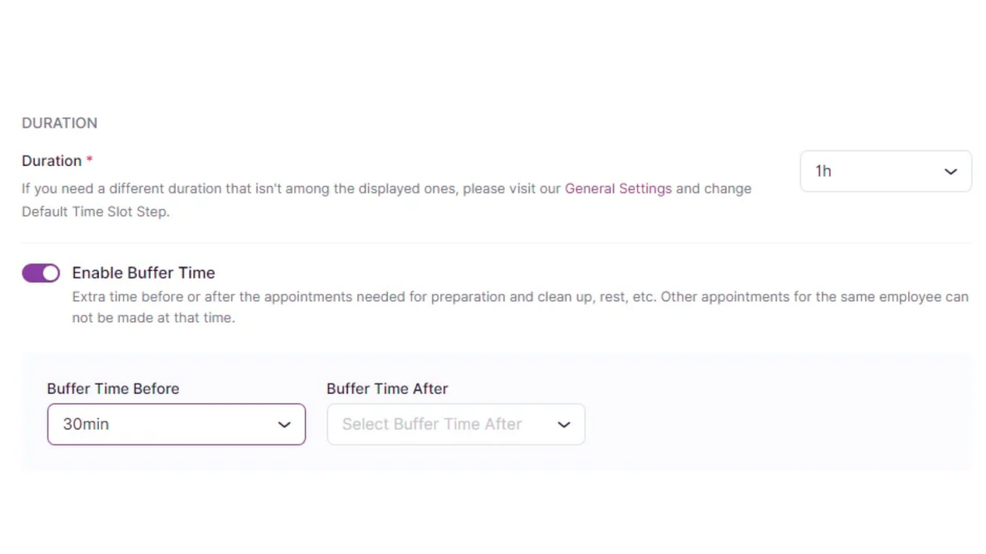 - Duration: Define the duration of the service. The available time slots will depend on the Default Time Slot Step set in the General Settings. If the desired time frame isn’t available, you can adjust the Default Time Slot Step in the General Settings.