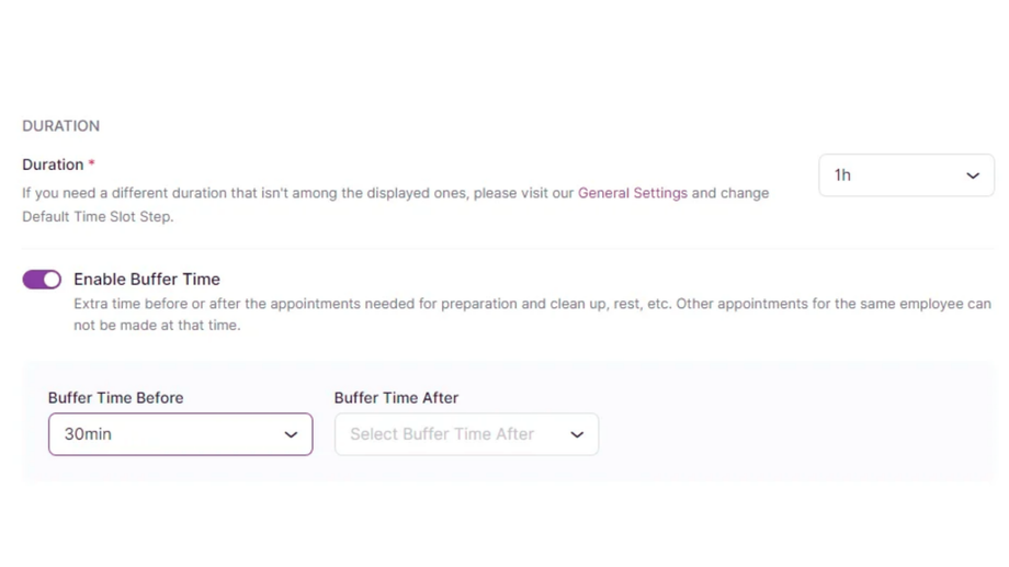 - Buffer Time After: This gives the employee additional time needed to rest or clean up after the appointment.