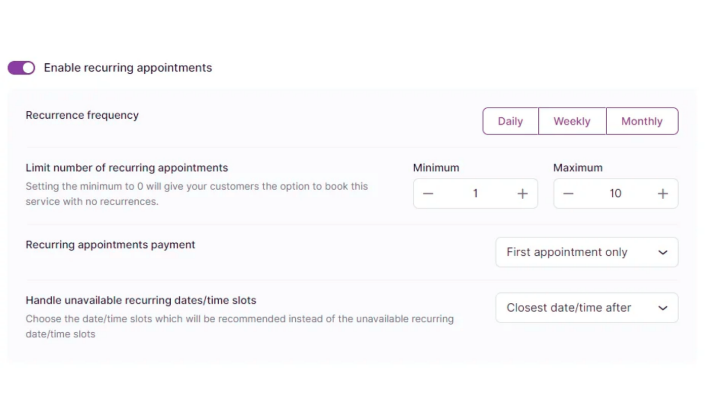 - Enable recurring appointments – Enabling this option allows you to configure this service for recurring bookings. Once enabled, you can choose the frequency (daily, weekly, monthly), set the minimum and maximum number of recurring appointments a customer can choose, configure how the recurring appointments will be paid for, and select how non-available recurring dates/times will be handled.