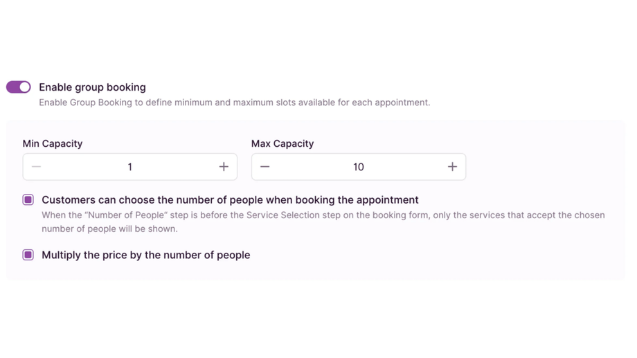 - Enable group booking – Enabling this option reveals two additional settings: Min Capacity and Max Capacity. Here, you define the minimum and maximum capacity for the service. By default, both values are set to “1,” meaning appointments can be booked for a single person only, without the option for multiple customers to book the same appointment. Once the Max Capacity is set to any number above 1, two new options will appear: