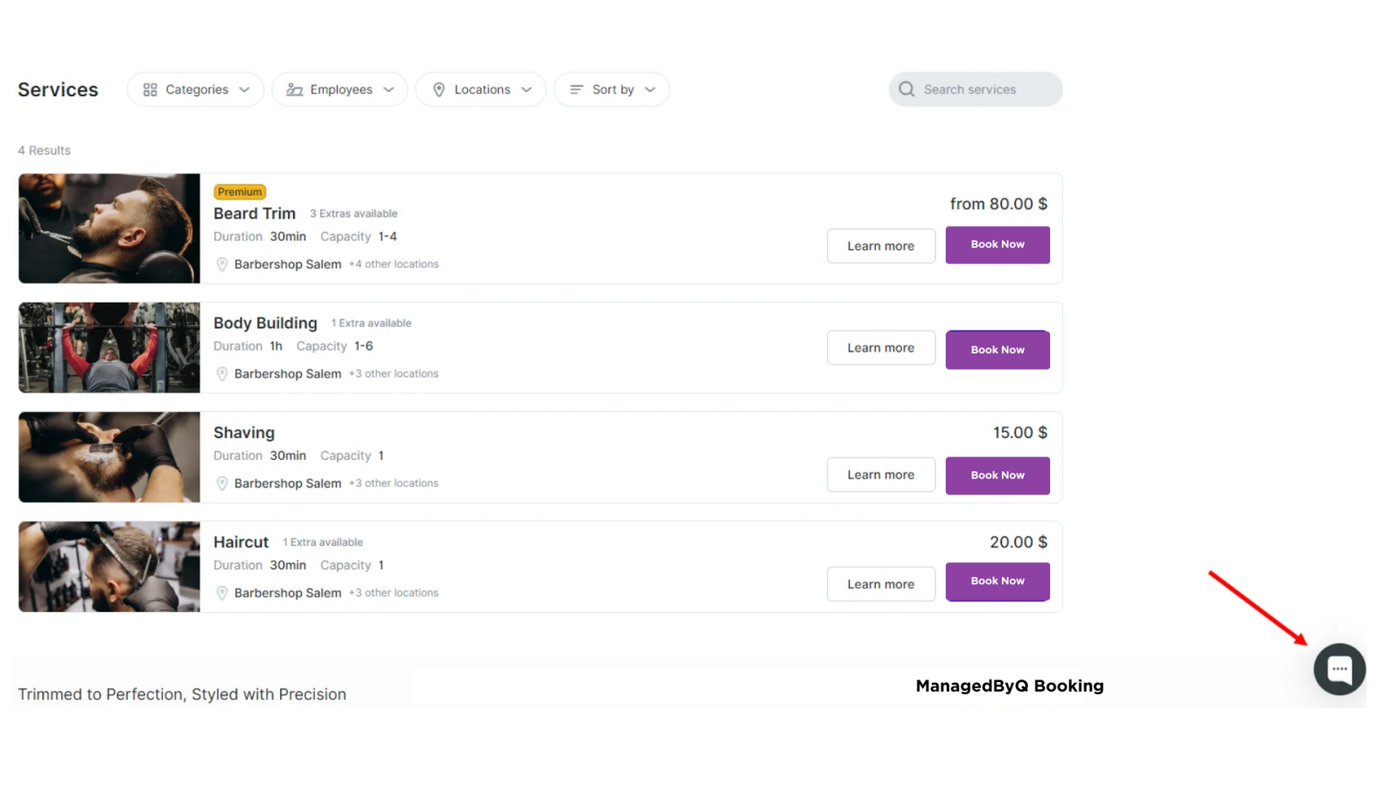 Once saved, the Chat Widget will be embedded into your booking website, allowing customers to easily reach out for support while booking appointments.