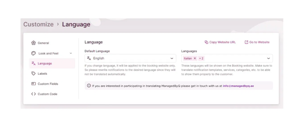- If you enable the Multilingual Support feature, you can set the default language for your booking website and invoices. Additionally, you can add extra languages, which will be displayed in the language drop-down on your booking website.