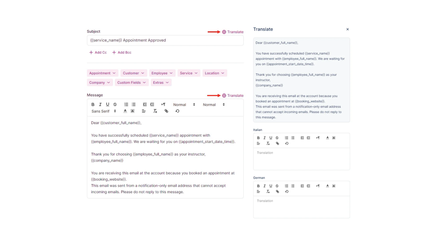 Default notification templates are not provided in languages other than English, but you can customize them and input text in any language of your choice. If you have activated the Multilingual Support feature, you can specify individual templates for each language selected in the Languages drop-down menu by clicking the “Translate” option in the right corner above the title and the body of the email template: