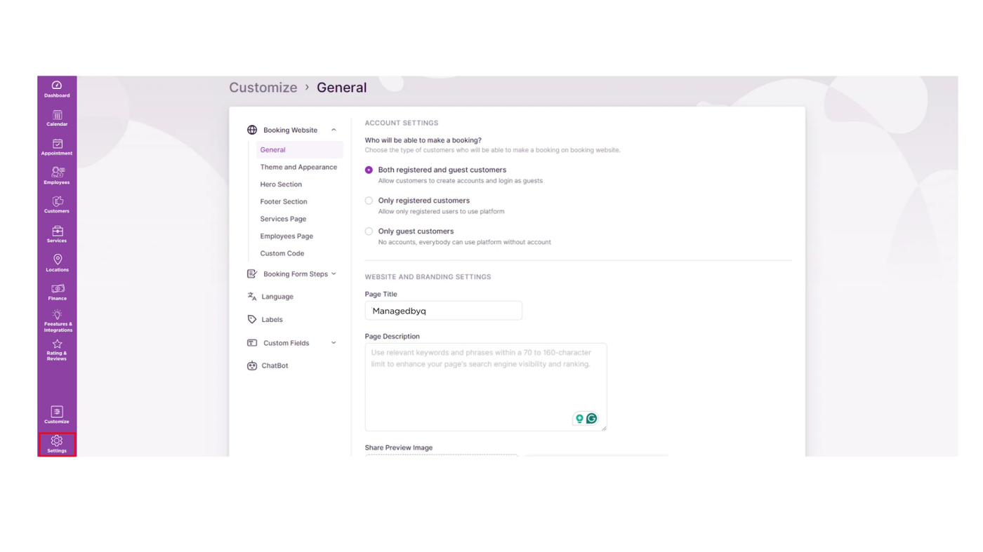 When you navigate to the Customize section, the “Booking Website” category will automatically expand, presenting you with the General subsection. Within this section, you will find two key settings: Account Settings and Website and Branding Settings.