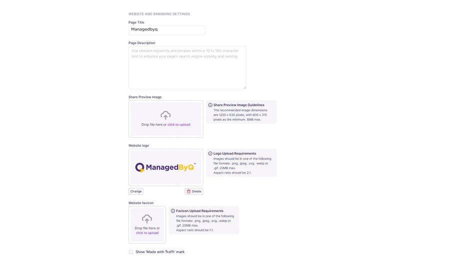 - “Made with ManagedByQ” Mark: Depending on your plan, you have the option to hide the “Made with ManagedByQ” mark on your website. This allows for a cleaner, more professional appearance without external branding.