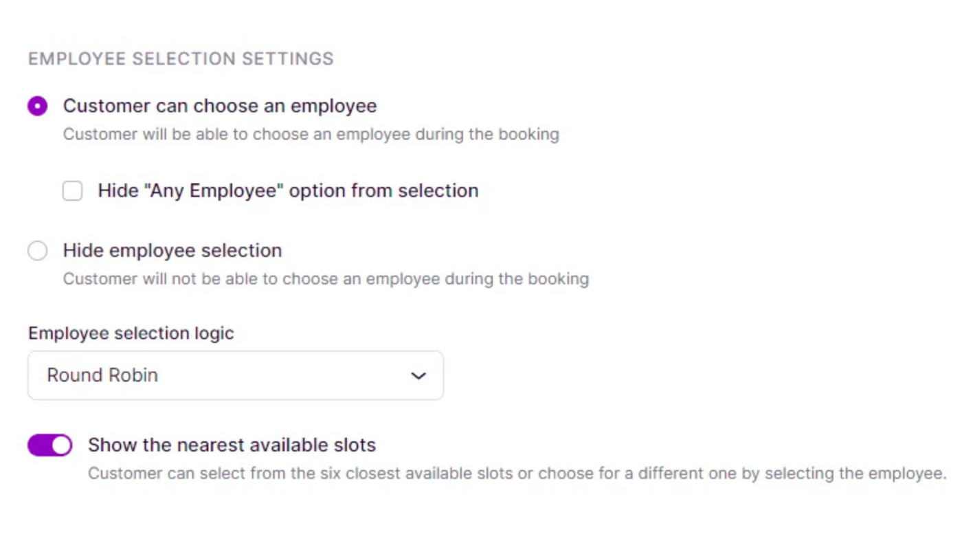 In the Employee Selection Settings, you can decide whether you want to provide clients with the option to choose an employee for their appointment. You can also establish the logic for selecting employees if a customer hasn’t made a specific choice. By enabling the “Customer can choose an employee” option, clients can select a specific employee for their booking or opt for the “Any Employee” choice, which will automatically assign an employee based on the selection logic.