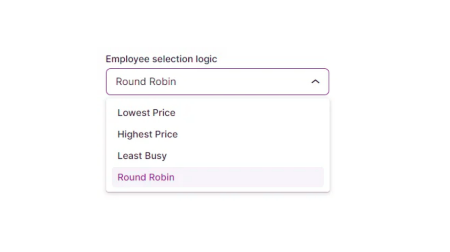 If a customer opts for the “Any Employee” choice on the booking website or neglects to choose a specific employee, you can define the logic for assigning an employee under the “Employee selection logic” dropdown. You have several options to choose from, including Round Robin, which assigns employees in a circular order, as well as options based on the Least Busy employee, the employee with the Highest or Lowest price.