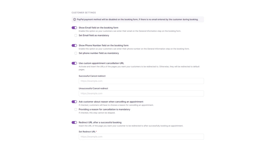 - Redirect URL after a successful booking: Similar to the “Cancellation Redirect” URLs mentioned earlier, this setting allows you to specify a custom page for customers to be directed to after successfully booking an appointment. This page can include a personalized message or information relevant to the booking.