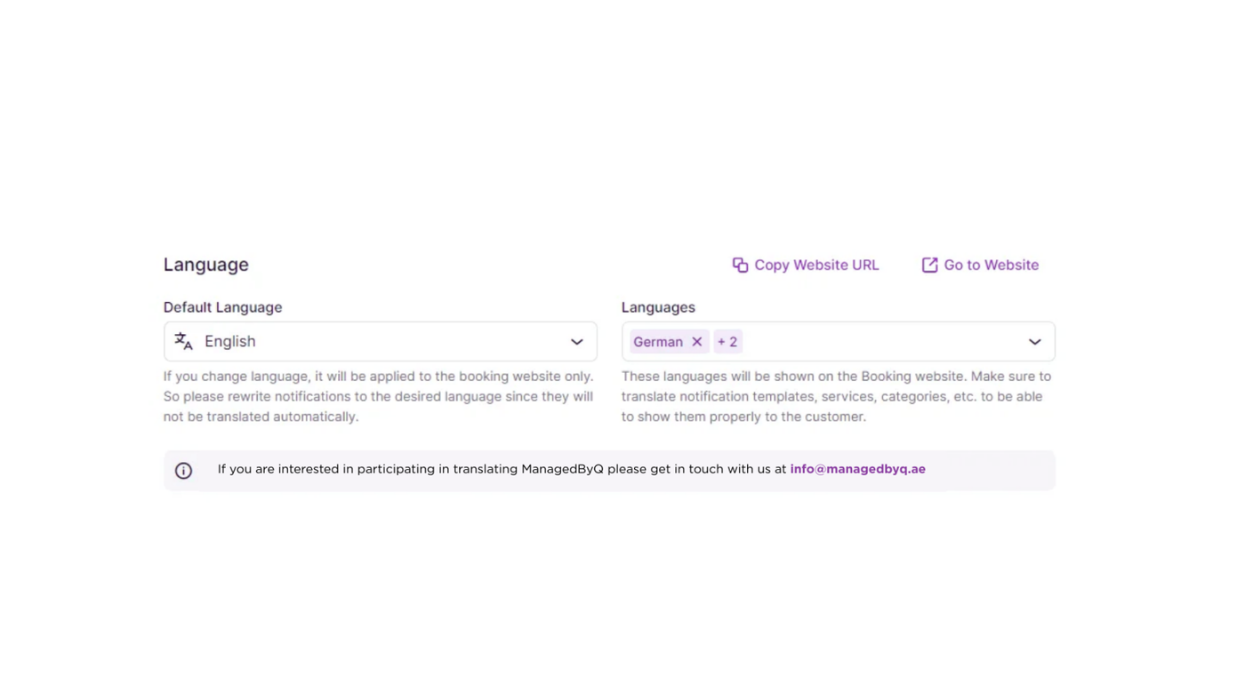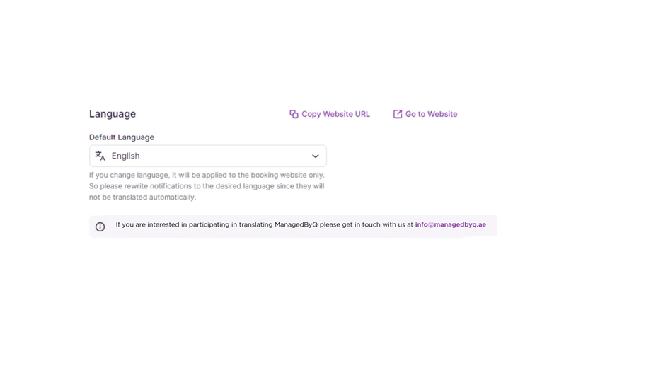 - With Multilingual Support enabled, you can configure the default website language and add additional languages for customers to choose from the language drop-down menu on the booking website.