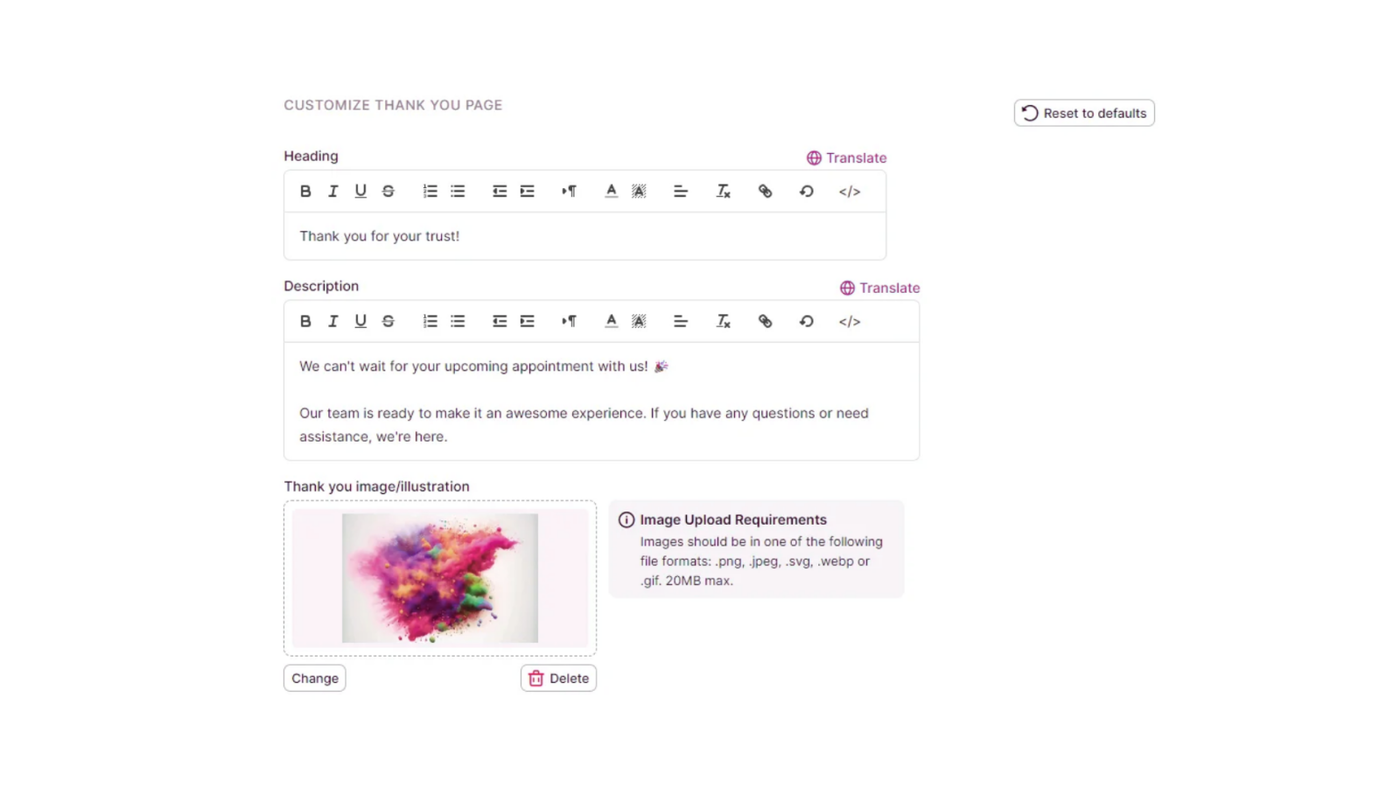 In the “Customize Thank You Page” section, you have the option to customize the content that appears after your customer successfully completes their booking. You can set a different image, heading, and description, replacing the default “Thank you!” text, “Your appointment is scheduled. We appreciate your trust and look forward to seeing you.” text, and default icon, respectively.
