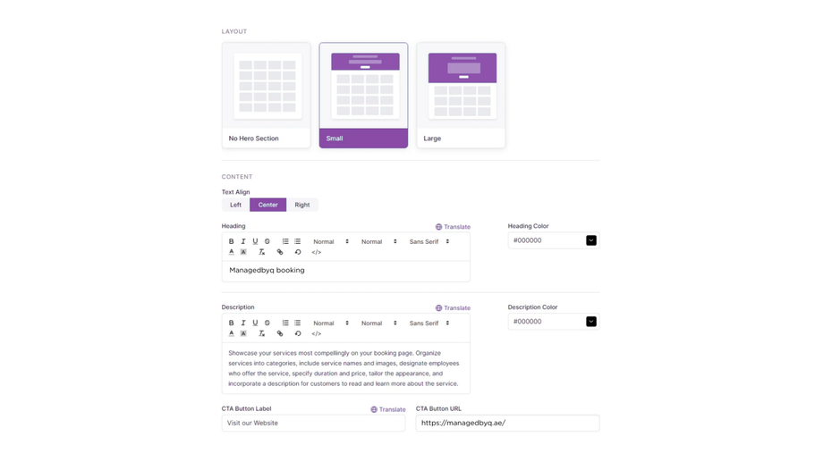 In the Hero Section, you have the opportunity to elevate the customization of your booking experience. You can choose the size of your Hero section and specify the content within it, including the heading, description, and text alignments.