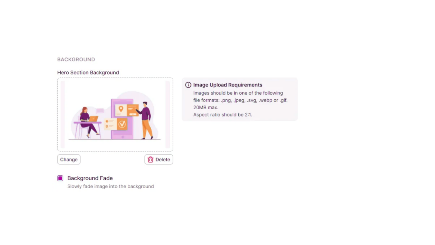 To add an image to your Hero Section, scroll down to the “Hero Section Background” section. Here, you can also apply a background fade effect.