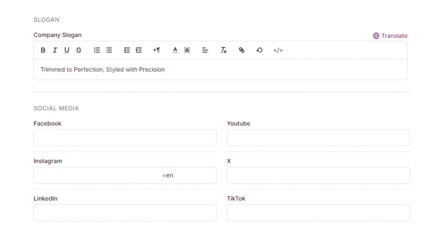 If enabled, the company Slogan, followed by links to your company’s Social Media (Facebook, YouTube, Instagram, X, LinkedIn, and TikTok) profiles will appear next. Here, you can define the slogan of your company and add links to the social media pages.