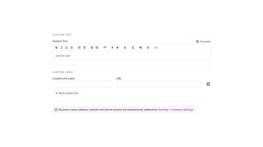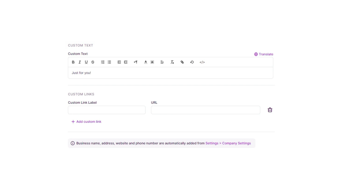 The last two sections allow you to add Custom Text and Custom Links that may be useful for your customers’ user experience.