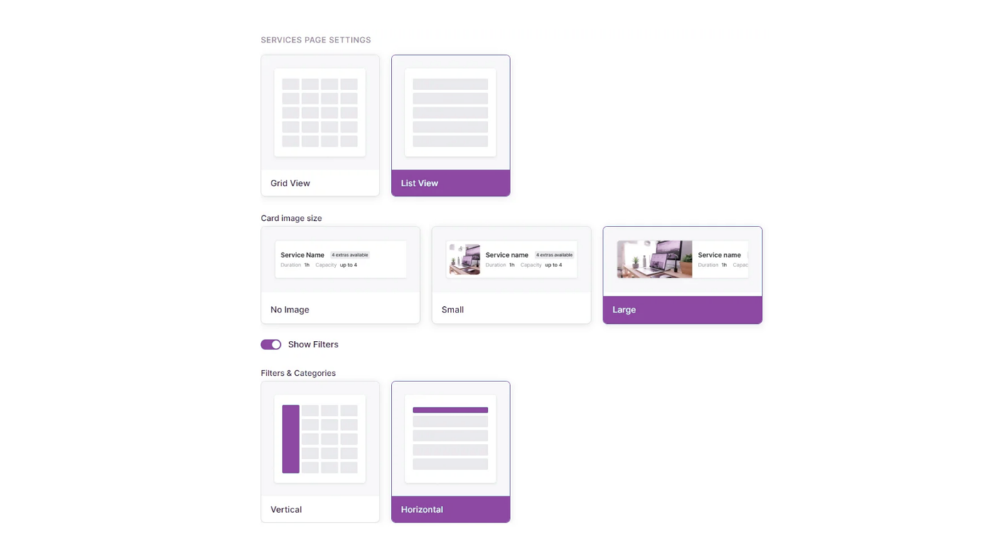 In the “Services Page Settings“, you can specify the presentation of your services on the Services page of the booking website. This includes the desired view of the services section, configuring the service image size, deciding whether filters will appear on the booking website, and determining their orientation, whether horizontal or vertical.