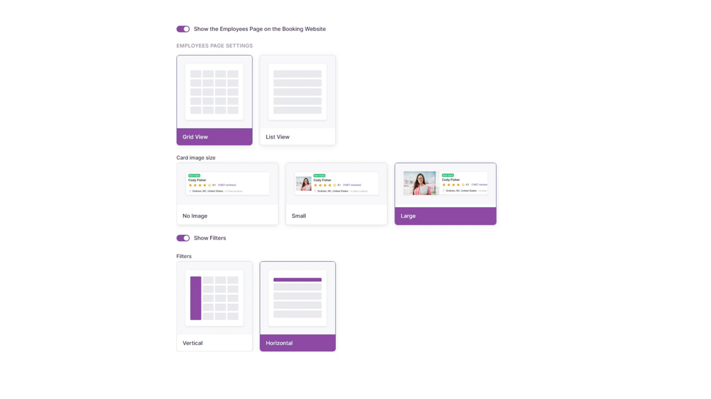 The “Employees Page Settings” allow you to customize how your employees are showcased on your booking website. At the top of this page, you can choose to enable or disable the Employees Page. You can also decide how the employees will be displayed—either in a grid view or a list view.