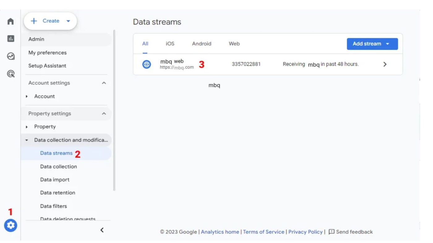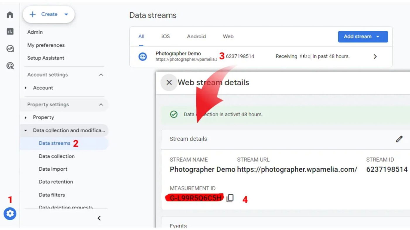 Access your Google Analytics 4 page, and click on the “Admin” (Gear) icon located in the bottom left corner. Next, navigate to “Data Collection and Modification” and then “Data Streams“. Here, you will find your existing Data Streams. Click on your specific stream to view and copy the Measurement ID: