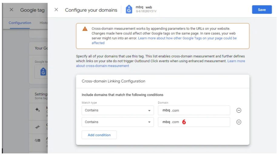 Step 4: Enter all domains that should be included in the cross-domain tracking setup and then click “Save” in the upper right corner: