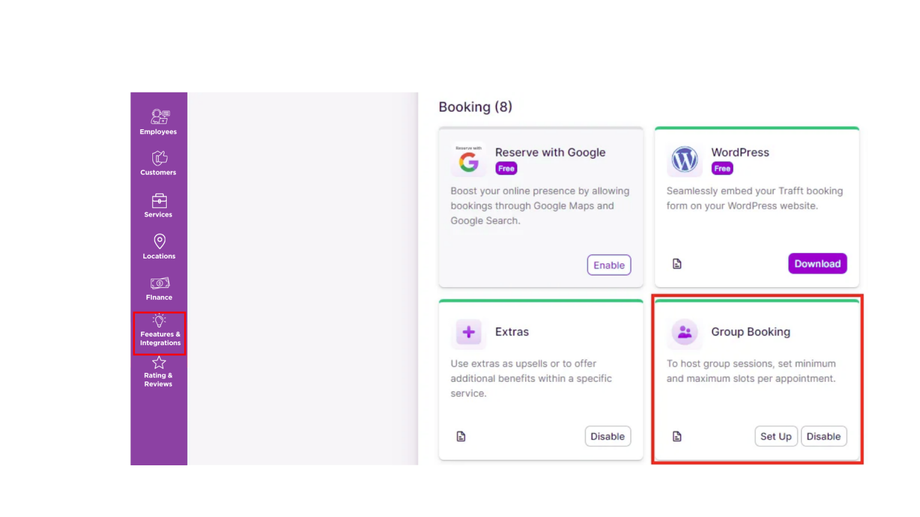 Group bookings are essential for managing classes, seminars, sports activities, and various other group sessions. To enable and accept group bookings, you need to activate our Group Booking custom feature through the Features & Integrations page.