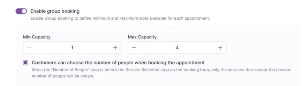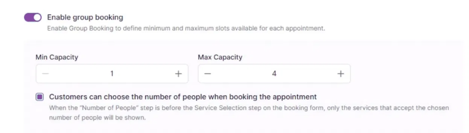 - No one will be able to book an appointment without meeting the minimum capacity, so if it’s set to “2” or more, they will be able to book for at least 2 people (or what was configured in the Service).