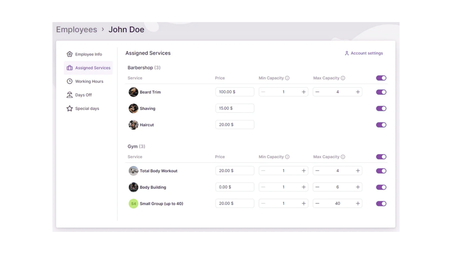 - For each enabled/assigned service, you can set a specific minimum and maximum capacity for the employee.