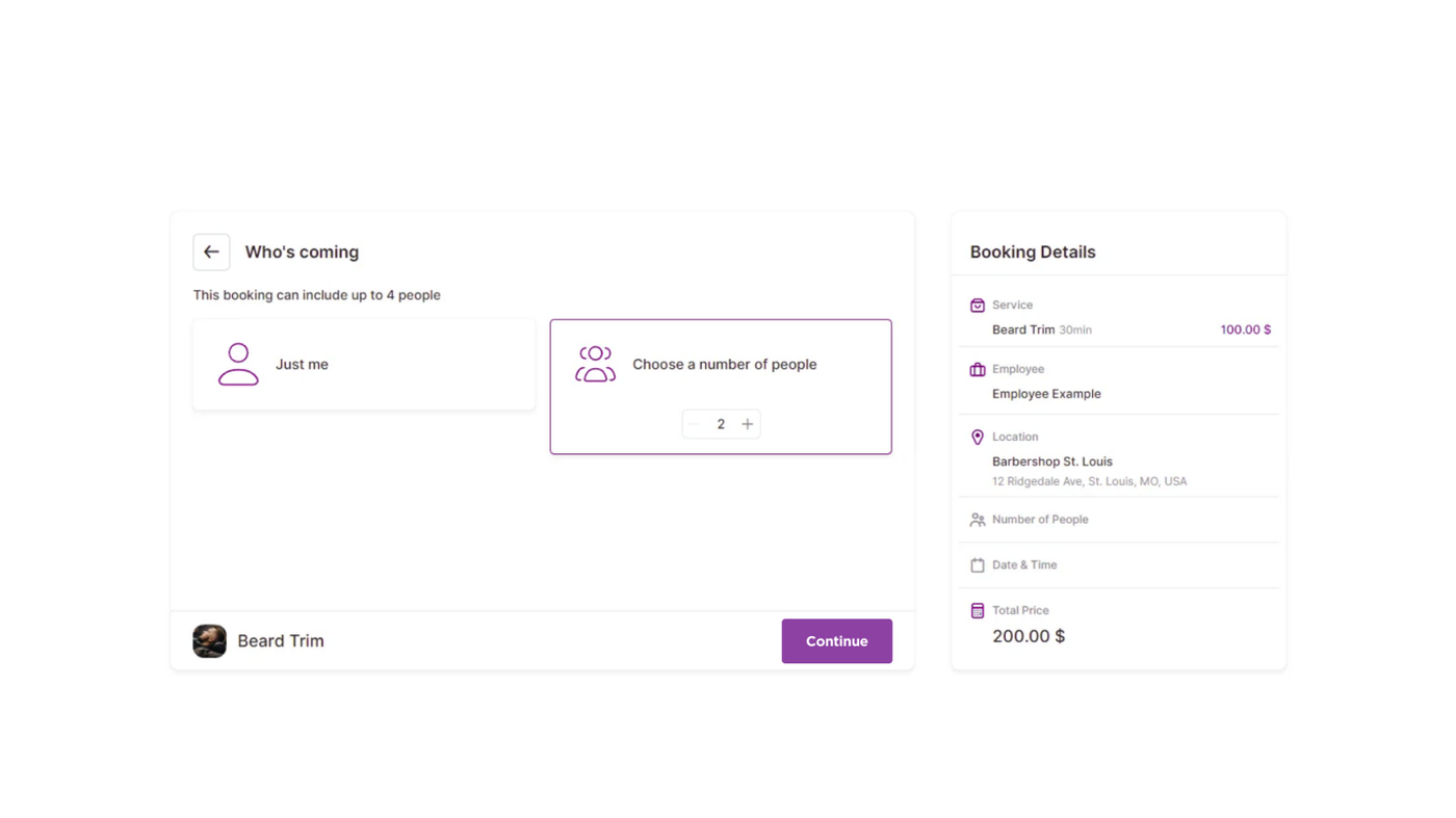 If you’ve set group capacities for your services and employees, during the booking process, your customers will see the option to choose whether they are coming by themselves or booking for more people. If they select to book for more people, currently, they will not have the option to provide additional information for those individuals. They will only enter information for themselves, but they will see the total number of people added in the Appointment Details and in the Detailed Pricing.