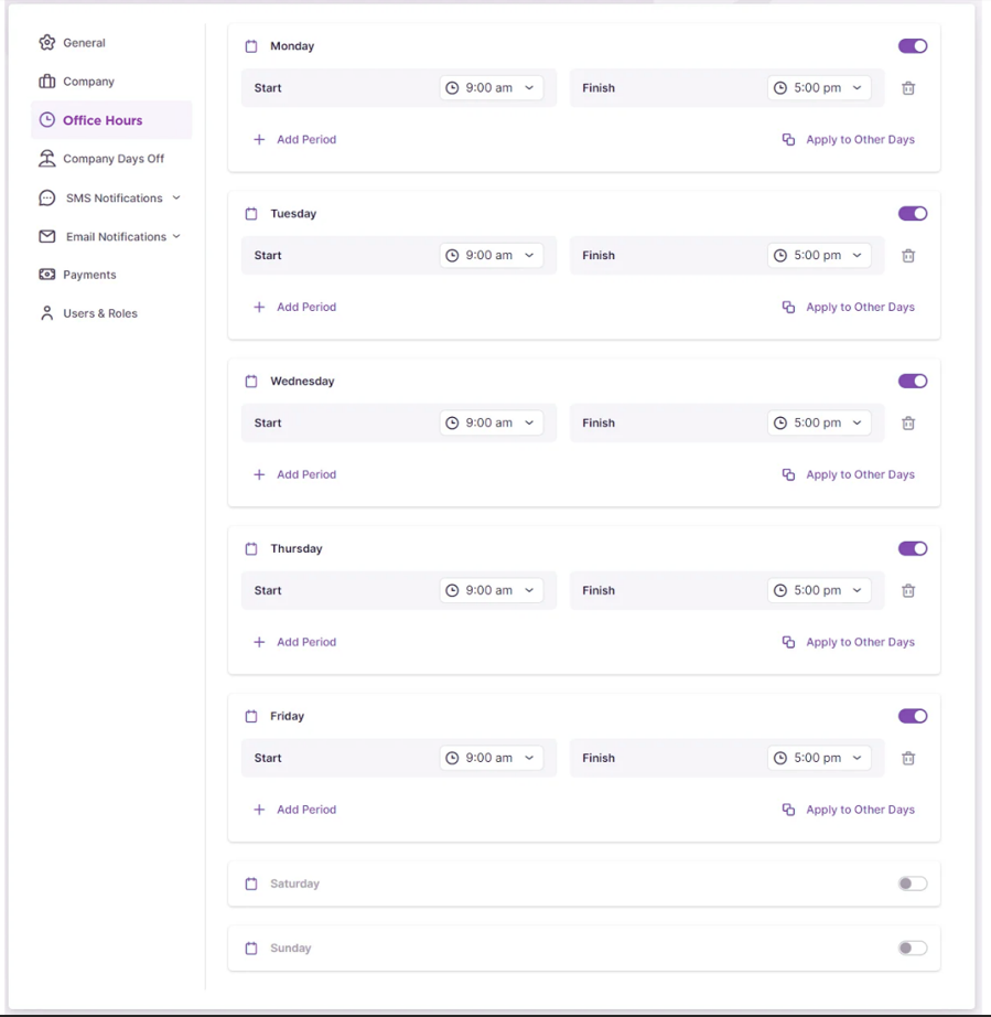 - Apply to All Days: Set the same office hours for all days of the week.