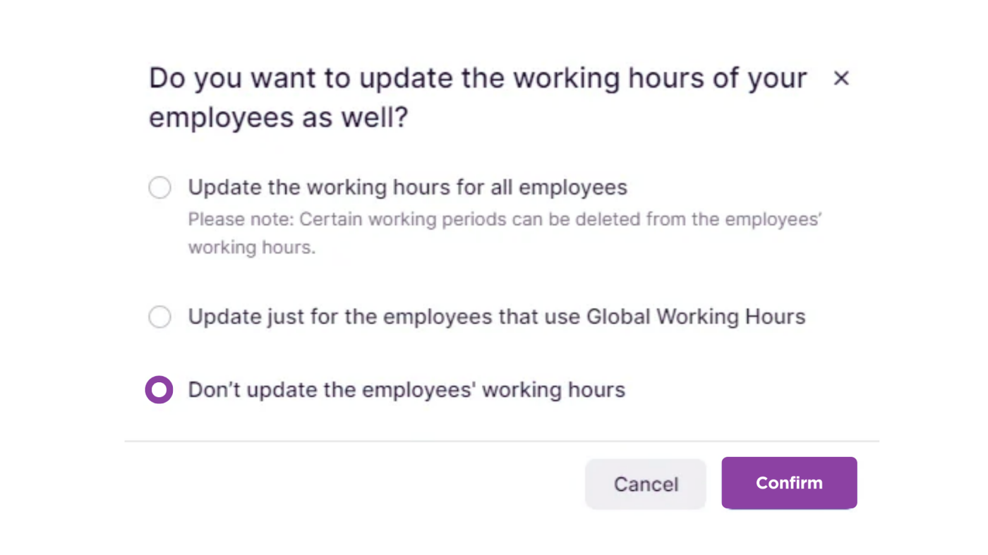 - Do Not Update Working Hours: Opt for this option if you prefer not to update the working hours of your employees. This maintains their current individual working hour settings but leaves the changes you’ve made to the Office Hours redundant.